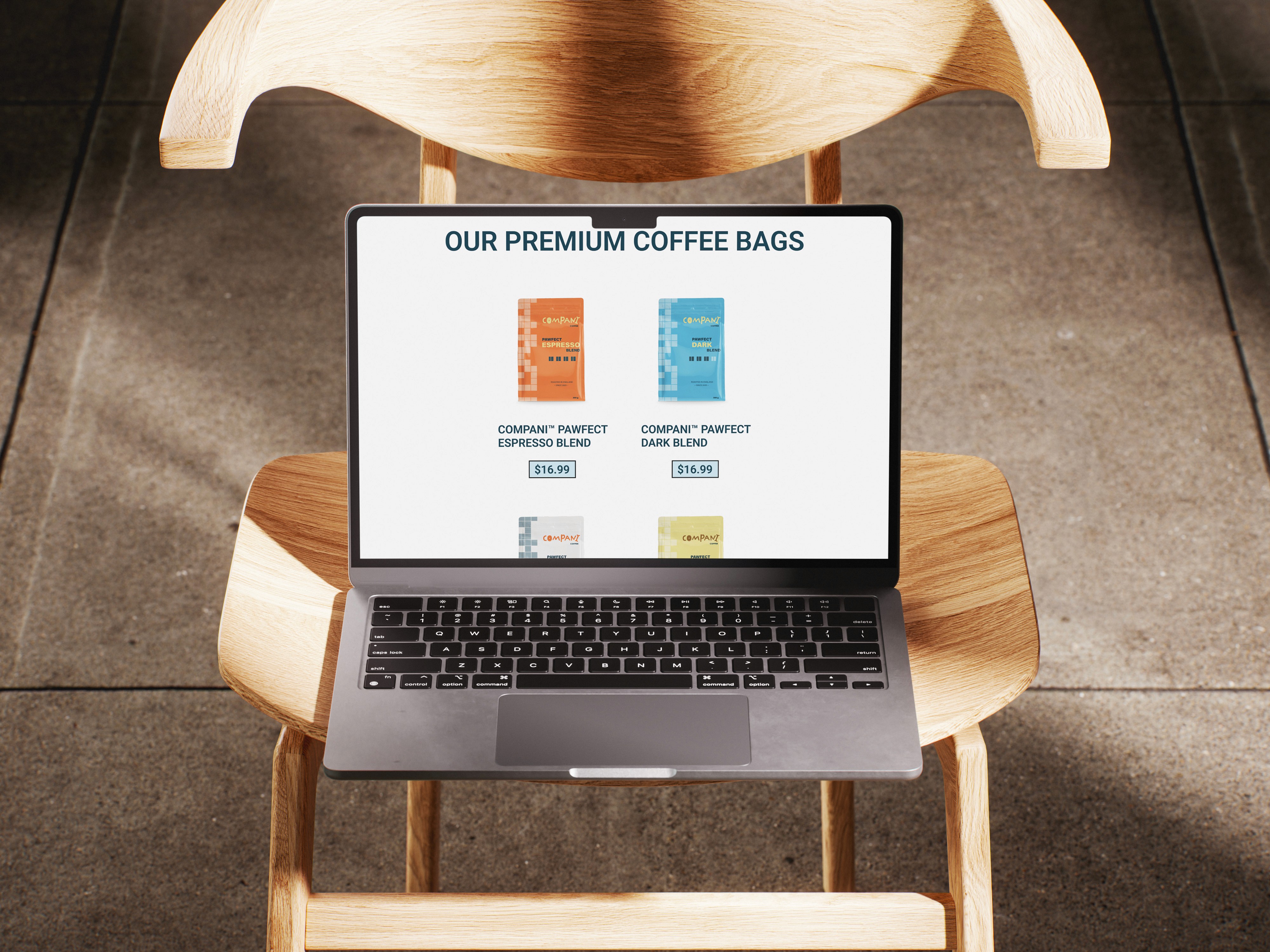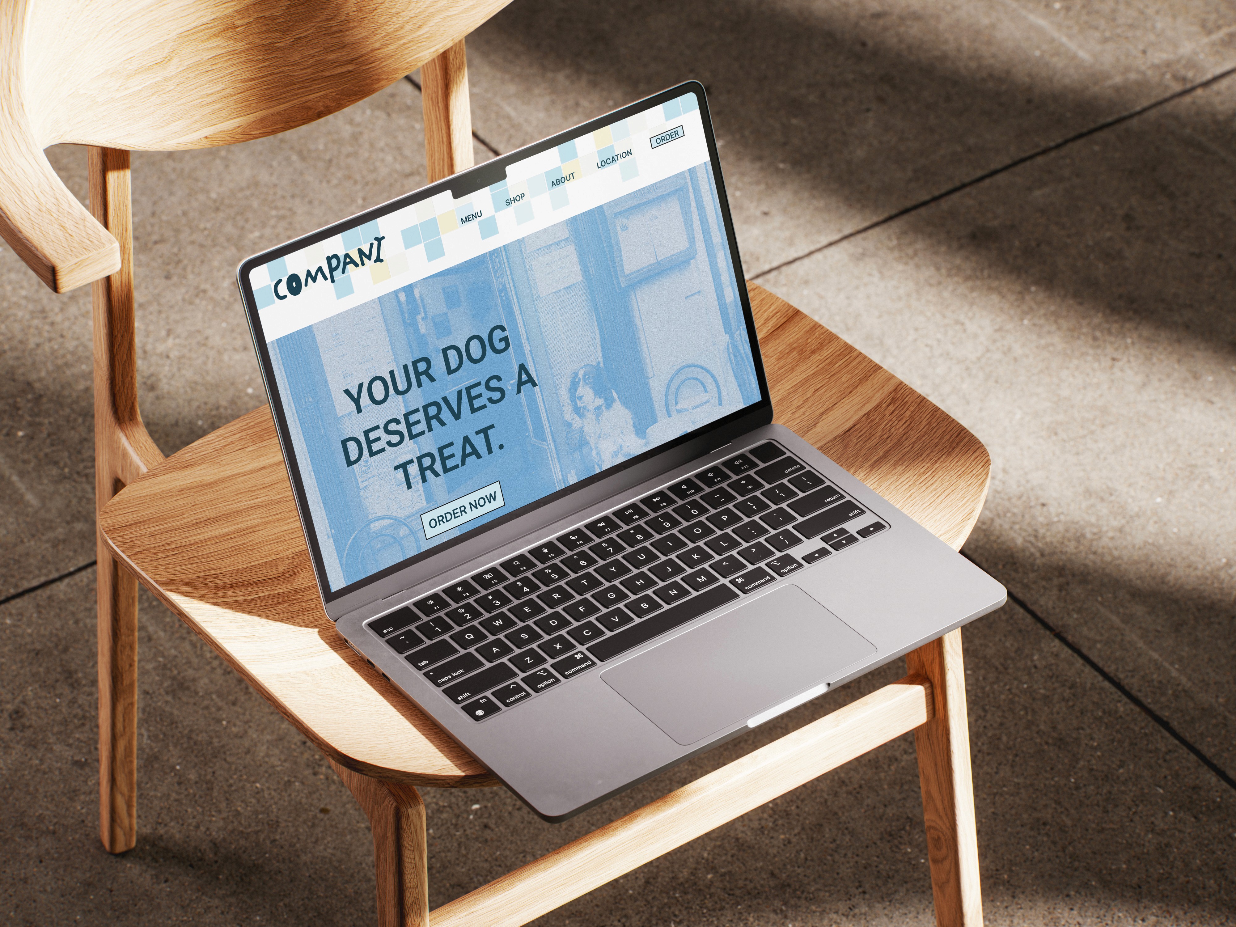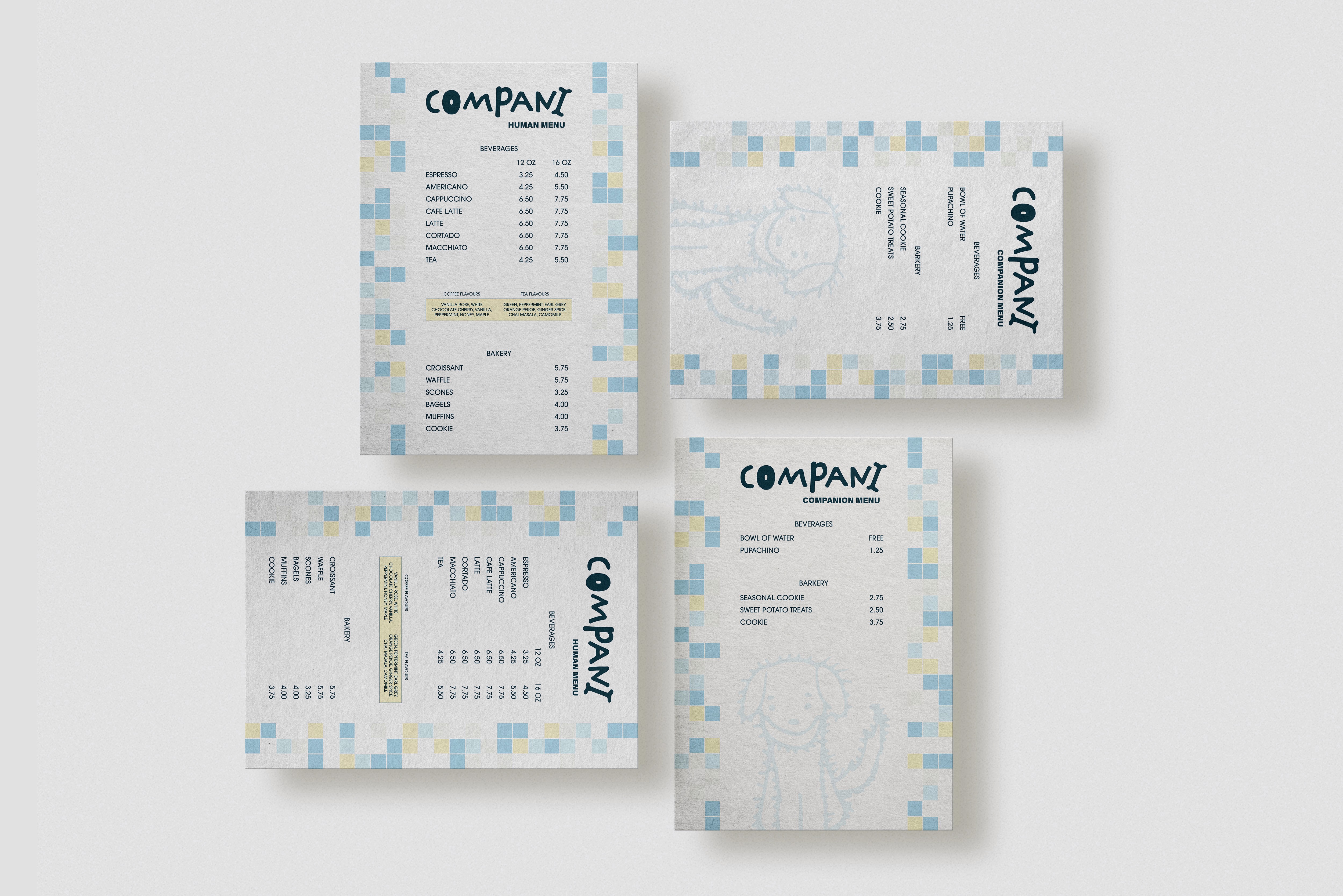 Compani is a pet-friendly café that aims to create a warm and inviting atmosphere for its brand. Emphasizing this theme, they also want to incorporate a playful element to reflect their love for animals. The primary colours used in their palette are blue and yellow, as dogs can only perceive colours within this range. Altogether, this design is cohesive and works well with the brand's image.